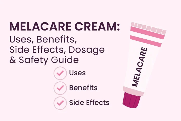 Melacare Cream is a prescription-only dermatological medicine widely used in the treatment of melasma, a skin condition that causes dark and discolored patches. It is formulated by Ajanta Pharma Ltd and is considered effective due to its unique combination of Hydroquinone (2% w/w), Mometasone (0.1% w/w), and Tretinoin (0.025% w/w).